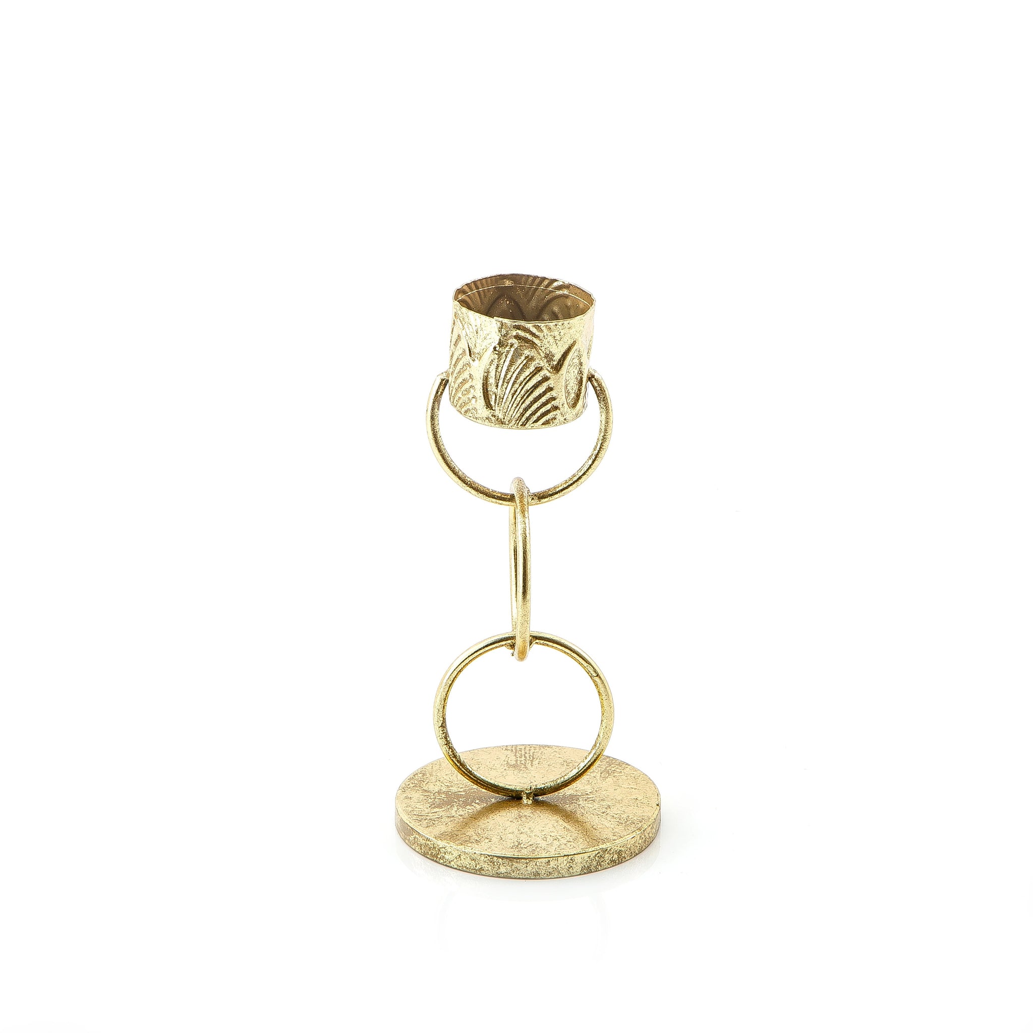 شمعدان معدني بشكل حلقات متداخلة بنقوش جميلة على قاعدة الشمعة، لون ذهبي وتصميم مميز