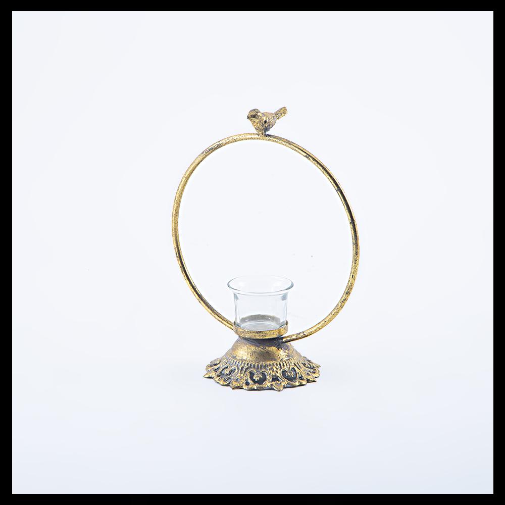 تصميم بسيط وراقي، شمعدان ذهبي اللون ودائري الشكل يعلوه طائر وقاعدة مزحرفة بنقوش بتفاصيل رائعة