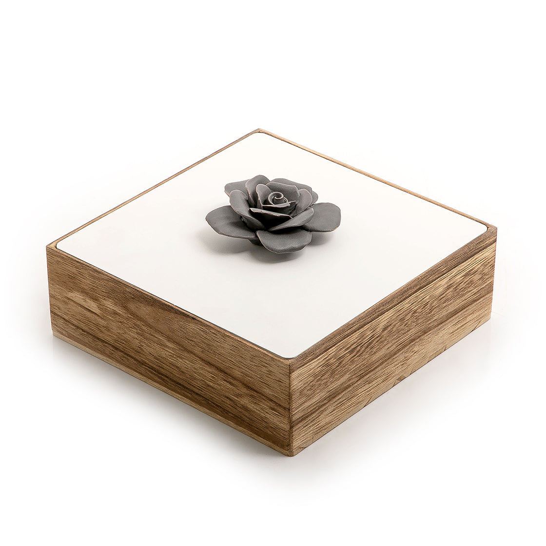 Wooden Box With White Cover And Ceramic Gray Rose Shaped Handle .
