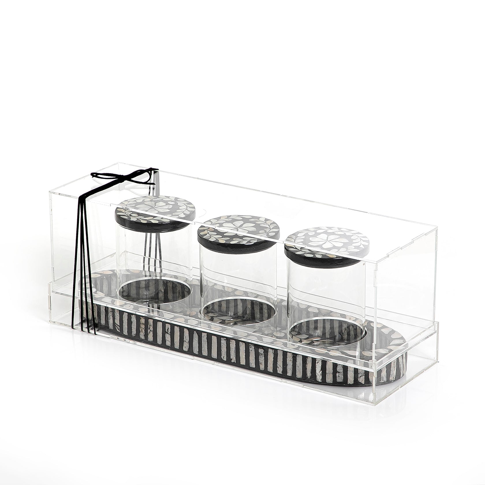Set of 3 jars with mother of pearl tray and acrylic cover
