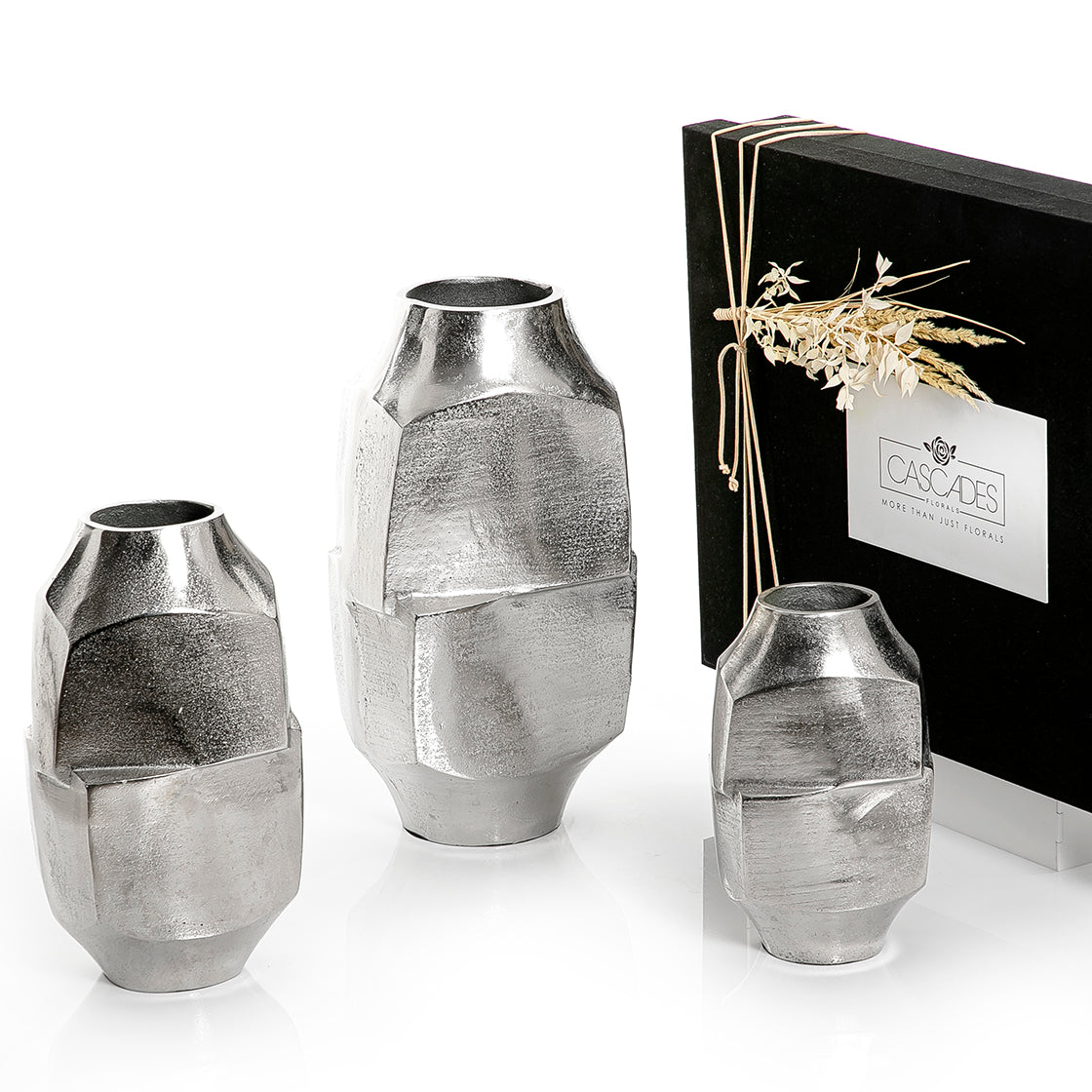 Creative Design Set Of Three Silver Vases Made Of Metal With Gift Box.