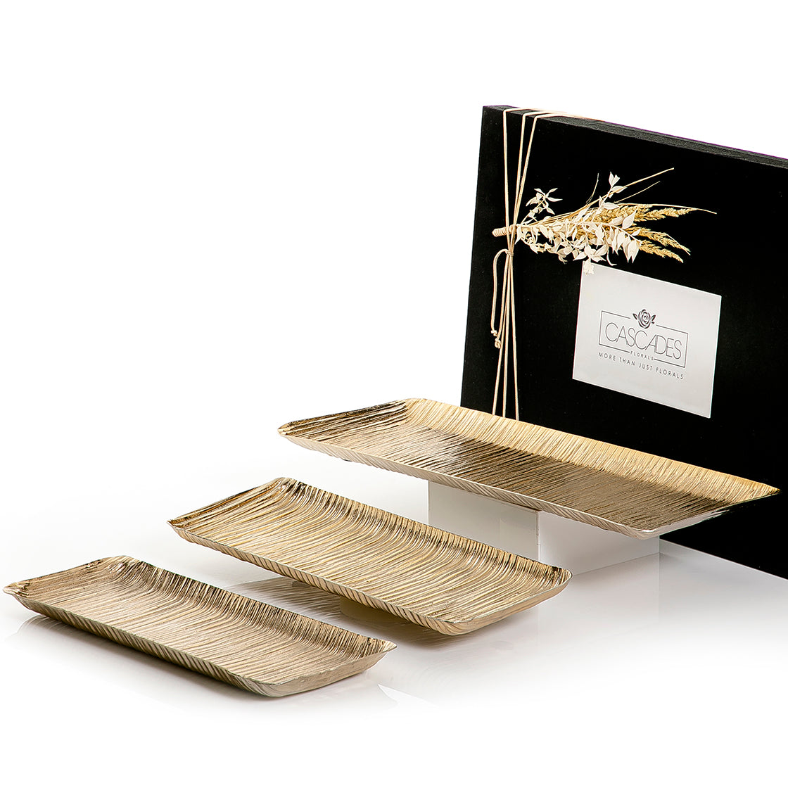 An Elegant Golden Set Of Three Trays Made Of Metal With Gift Box.