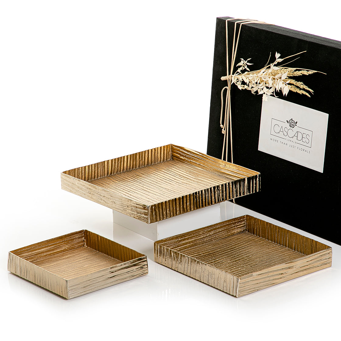 An Elegant Golden Set Of Three Trays Made Of Metal With Gift Box.