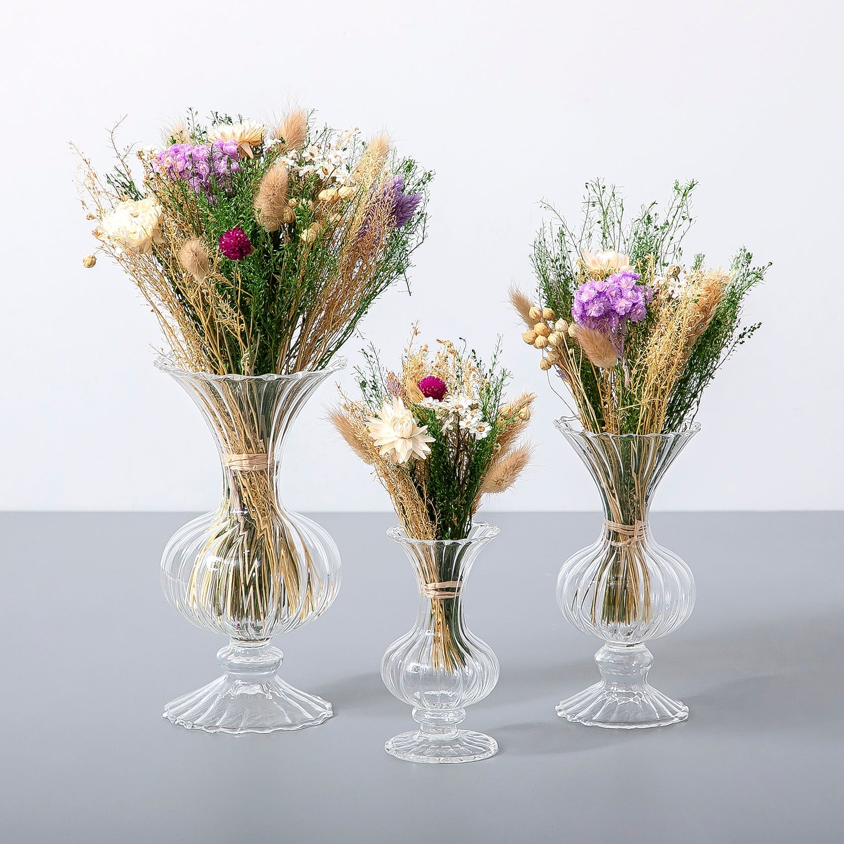 An Exquisite Set Of 3 Vases Made Of Glass With Bewitching Dried Flowers .