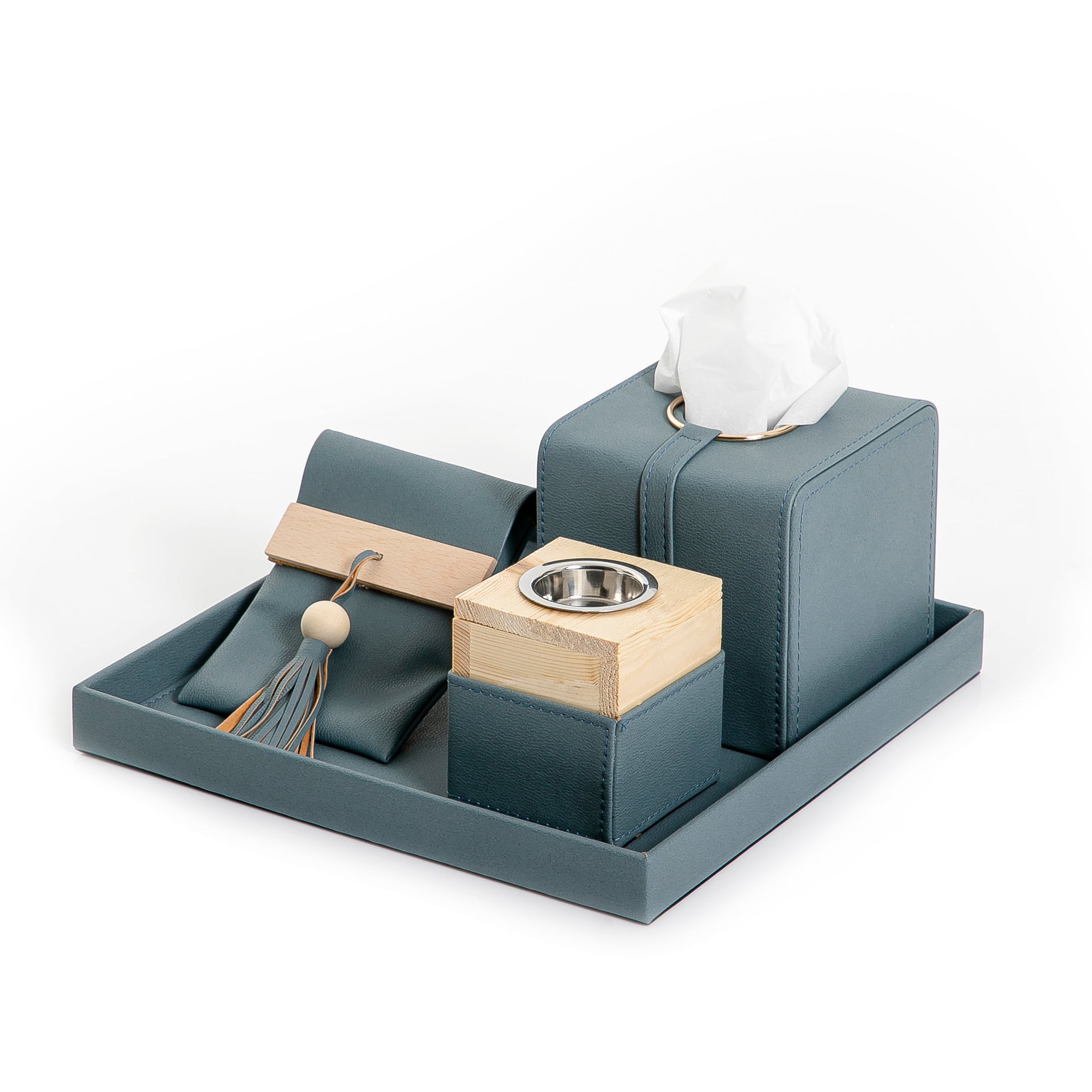 A luxury set of tray with mabkhar and tissue box made of leather that will uplift the look and vibe of your living room decor.
